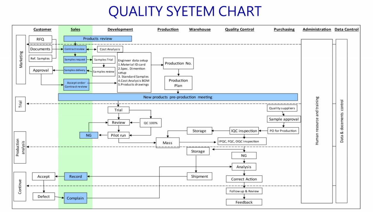 Við skipuleggjum fund fyrir hverja nýja pöntun fyrir framleiðslu, allir leiðtogar eða rekstraraðilar frá tilheyrandi deildum þurfa að mæta á fundinn. QC leiðtogi þarf að skrifa niður allar gæðakröfur og atriði sem þarf að huga að.